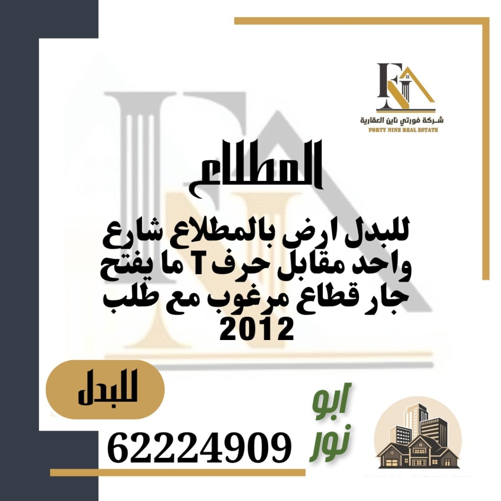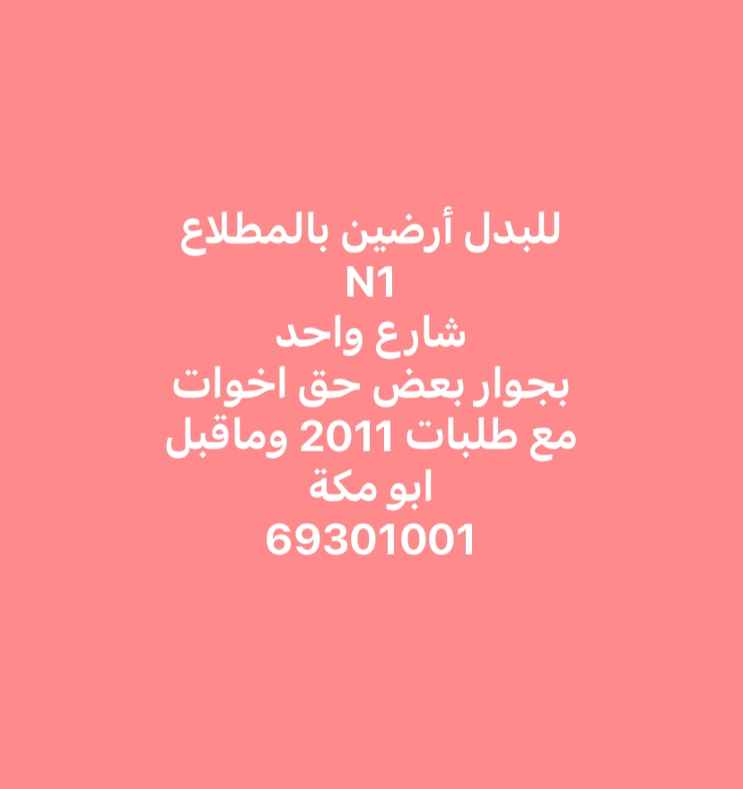 In exchange for two plots of land in Al-Mutlaa, one street next to each other, the rights of sisters, with an application from 2011 and before... The exchange is for land on N5 street and railway, with an application from 2007 and before... For the exchange, the land of Al-Mutlaa, 3 frontages, B12, with an application for 2012 and before. ...For exchange, land, south of Abdullah Mubarak, one street, with Al-Mutlaa, one street...For exchange, a villa, west of Abdullah Mubarak, three floors and a basement, one street with Al-Mutlaa, land location or request 2007 and before