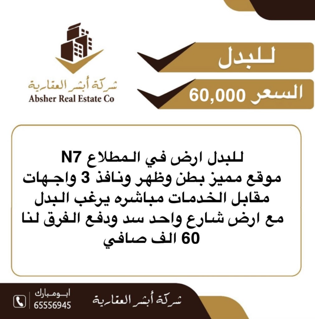 For exchange, corner of a public street, N12, next to services with a dam. ✅️🌷🌷 One street, N6, easy entrance and exit, with a voucher for Wafra. ✅️🌷🌷 Belt, back, and N6 road, 15-meter setback, with a dam. ✅️🌷🌷 One street, N12, easy entrance and exit, from 2012 and before. ✅️🌷🌷 Corner of two streets N5 in exchange for services with 2008 and before ✅️🌷🌷 3 streets N3 in exchange for services with a dam ✅️🌷🌷 Corner of two streets N12, hallway of the plot with 2012 And before ✅️🌷🌷 one street N1, shadows of the era with 2012 and before ✅️🌷🌷 the belly and back of the N7 area hallway with 2010 and before ✅