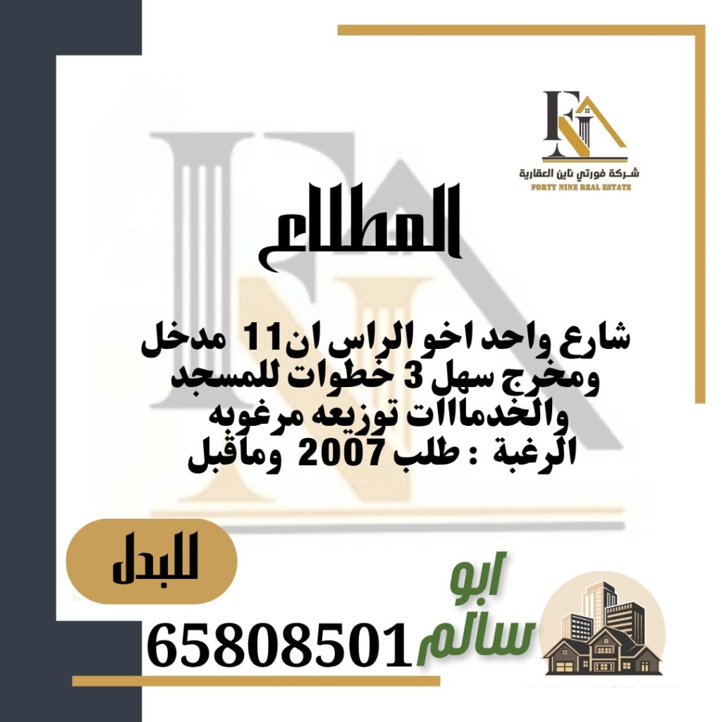 ⏳️Al-Mutlaa Offers⏳️ 🔺I have one street that opens to the east of Akhu Al-Ras, steps from the services, with the request of 2012.🔺I have a street and a street directly on the services for exchange, with the request of 2012. 🔺I have a street and a lane for the exchange, with the request of 2008.🔺I have one street, 3 steps from the N11 mosque, with the request of 2007 and before. 🔺I have a head of 3 sides, an area hall with 2012 and before 🚨Abu Salem 🚨🛑 65808501🛑
