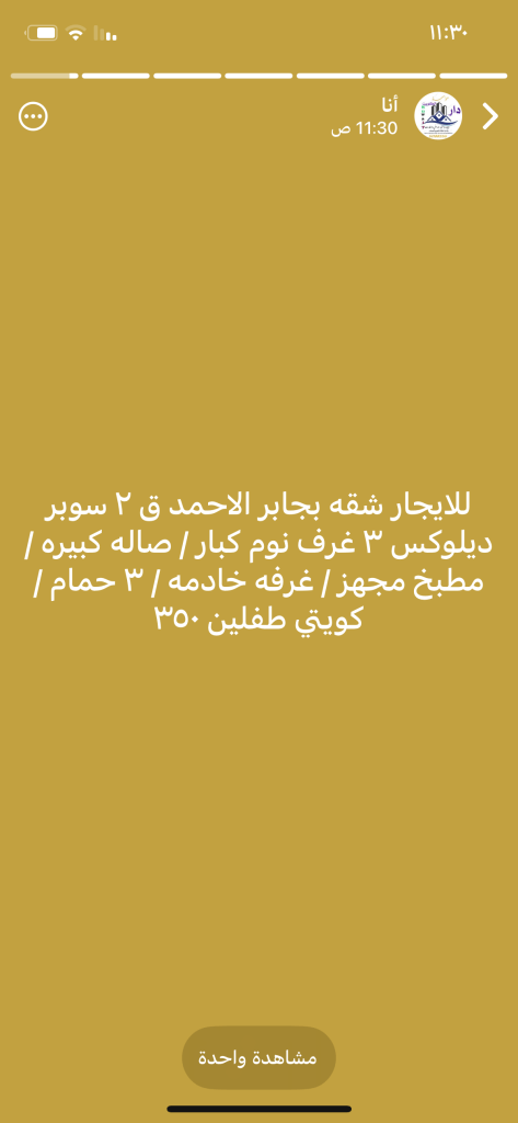 Jaber Al-Ahmad apartment, 6th floor, 3 rooms, hall, 2 bathrooms, maid’s room with bathroom, 2 curtains, Kuwaiti groom only....Al-Mutla’’s brother, 11/4/10