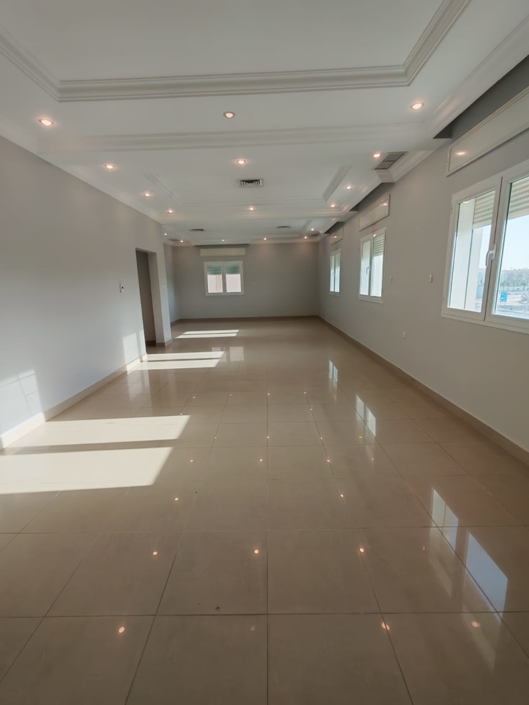 With 3 shaded parking spaces, for rent, a second floor in Al Salam, Block 5. The floor is cleanly finished and consists of 4 bedrooms, 3 of them master, a hall with a bathroom, guest sinks, a kitchen, a laundry room, and a servant’s room with its bathroom, 3 shaded parking spaces + an elevator + central air conditioning. The rent is 750 KD, final. For inquiries, 97880588 Bouhamad.