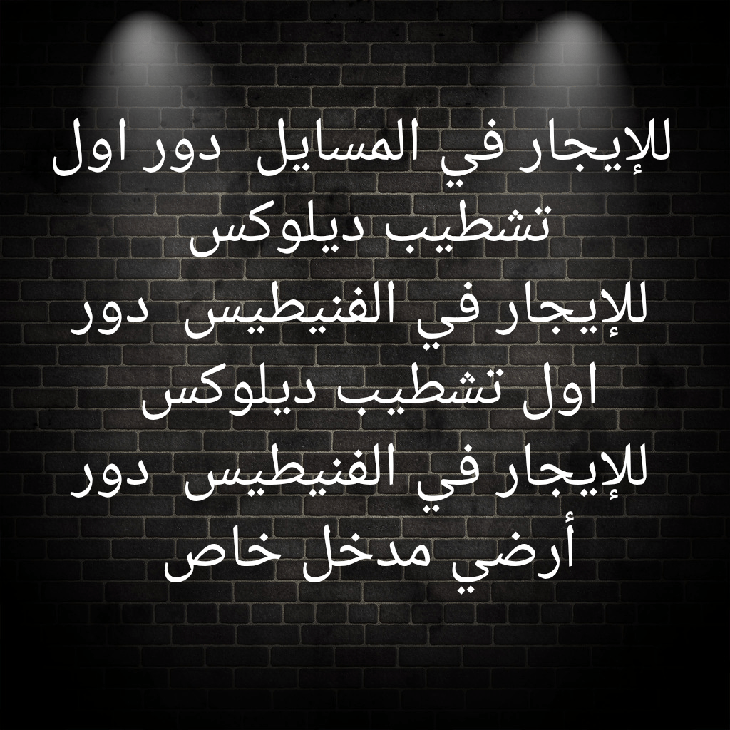 For rent, an apartment in Al-Masayel, a luxurious VIP finish, the first inhabitant, an apartment with 3 large master rooms, a fourth room for the master maid, a large hall with a guest bathroom, hotel air conditioning, a thermostat for each room, a central vacuum, an elevator, a private entrance to both apartments, an equipped kitchen, two parking spaces for each apartment with an awning. For inquiries