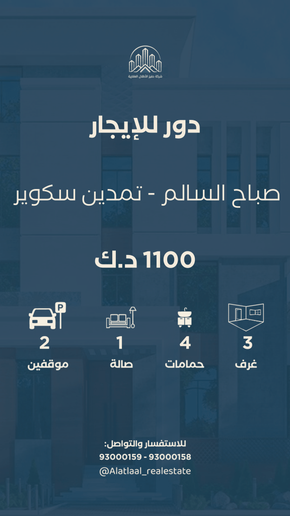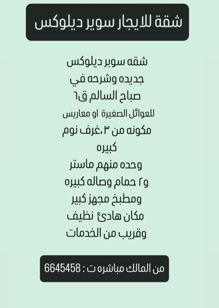 In Sabah Al-Salem, block 13, super deluxe. The house is new and the location is excellent. Front and back, shaded parking and electric shutters, central elevator, hot and cold, central satellite. The apartment has two rooms, one of them master + a large maid’s room with bathroom + hall, bathroom and kitchen, including electricity and water, without commission, without the intervention of intermediaries, only a groom or a child.