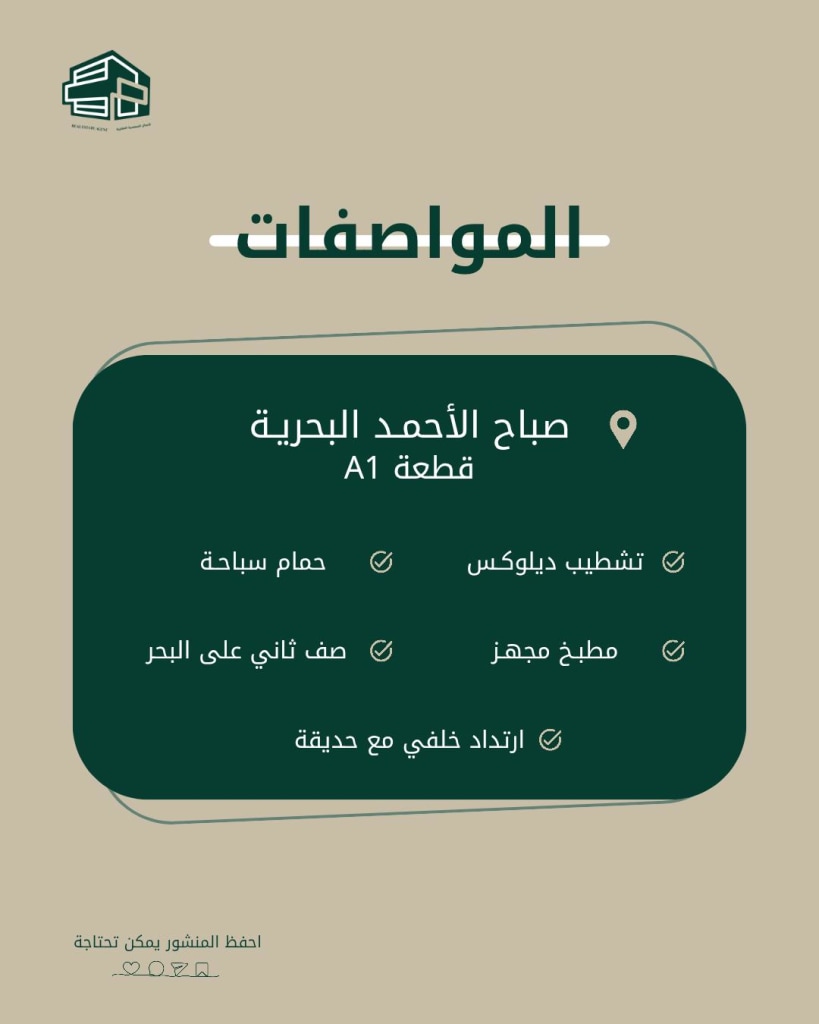 For sale, a chalet on the sea in Sabah Al-Ahmad Marine City 💠 New construction, not inhabited 💠 Area 465 meters 💠 Excellent location 💠 Backyard 💠 Two and a quarter floors and a swimming pool 💠 Ground floor halls, two bathrooms, sinks, master room, kitchen, caretaker’s room and swimming pool 💠 First floor 5 master rooms, a hall, bathroom, sinks and a preparatory kitchen And a balcony 💠 The second floor has a room for the maid, a storeroom and a laundry room 💠 The chalet is new and has not been lived in 💠 The price is 385 thousand 💠 No intermediaries