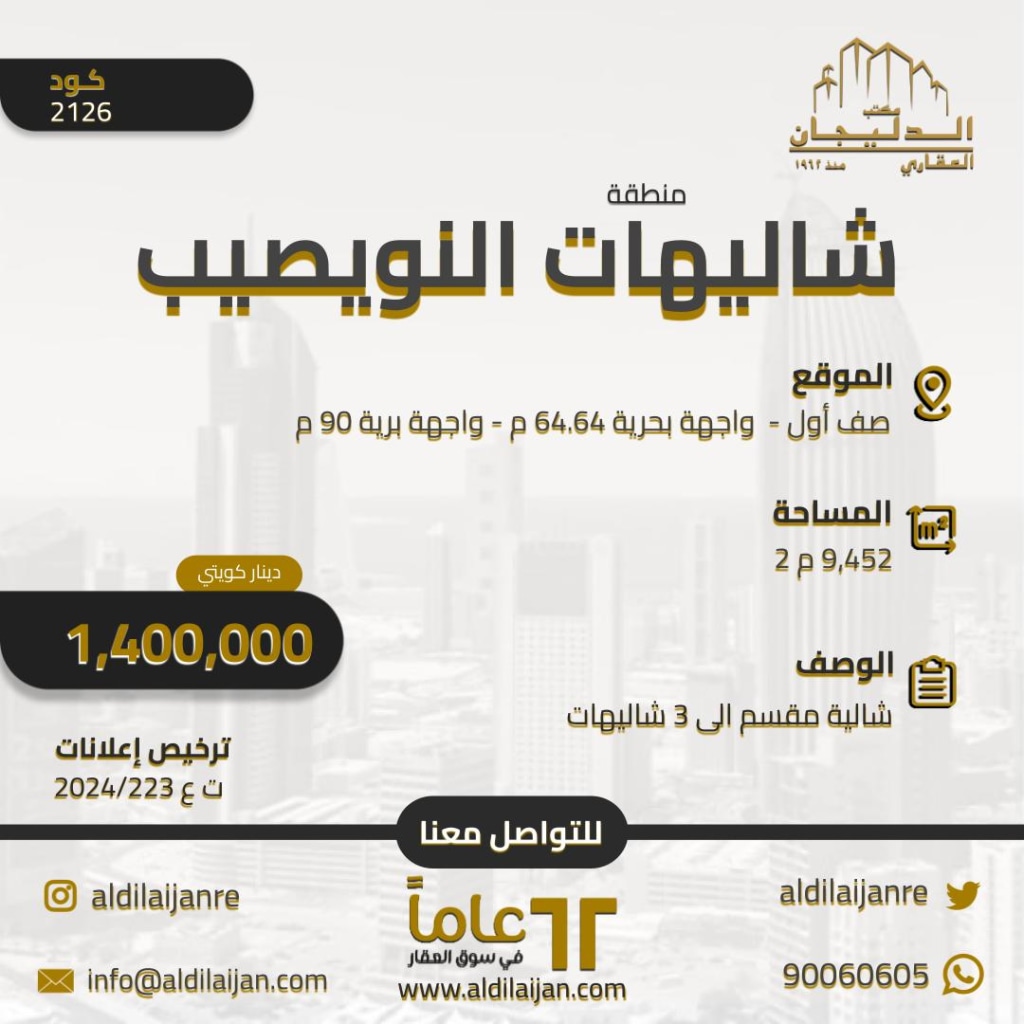 For sale 💠 Chalet on the sea 💠 in Sabah Al-Ahmad Marine City 💠 in the first phase 💠 under construction 💠 area 1318 meters 💠 sea frontage 30 meters east 💠 building on black and selling in its current condition 💠 it can be divided into 3 villas. Each villa consists of a basement + ground floor + first floor + second floor + elevator. The price is 390 thousand. To contact ☎ 66637415-99552828