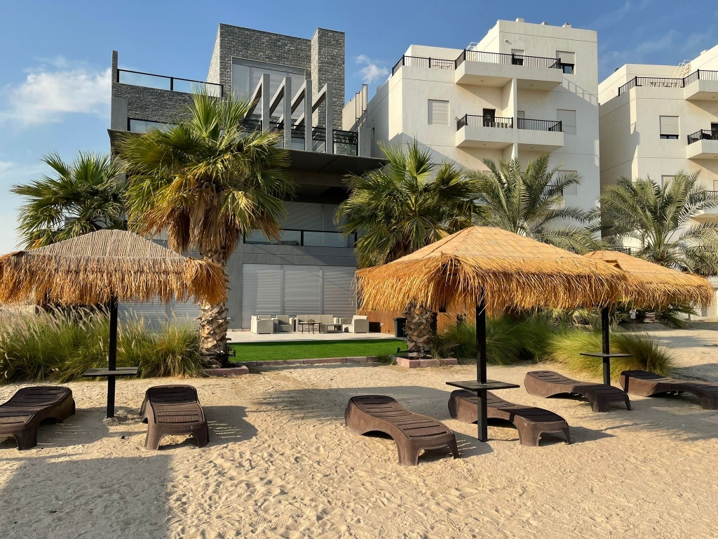 The chalet is ground floor and services, with an area of 478 square meters. It consists of 4 master rooms, a hall with a guest bathroom, a fully equipped kitchen, and services. A maid’s room, a house with a bathroom, a heater room, and an empty surface equipped for outdoor seating. A swimming pool of 3.5/6.5 and an outdoor bathroom for the beach, an outdoor seating, spinner and bouncy games, sitting directly on the sea, a pond, and artificial grass. You can put a seat in it.